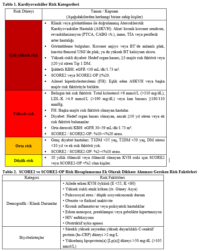 Tablo 2’de SCORE2 ve SCORE2-OP algoritmalarına dayalı risk hesaplamasına ek olarak dikkate alınması gereken risk faktörleri belirtilmiştir.