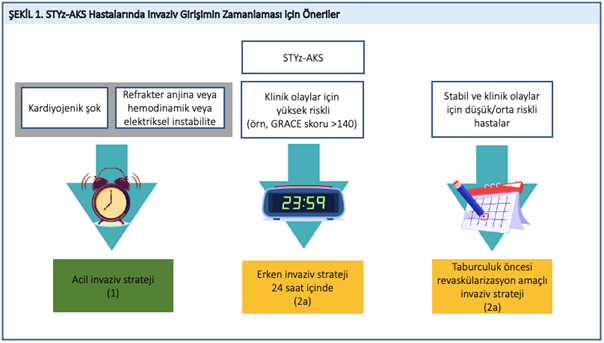 4. Başlangıçta stabil olan fakat klinik olaylar açısından yüksek riske sahip olan STYz-AKS hastalarında, sonuçları iyileştirmek için erken invaziv girişim (24 saat içinde), gecikmiş invaziv girişime tercih edilmelidir (11-16). |