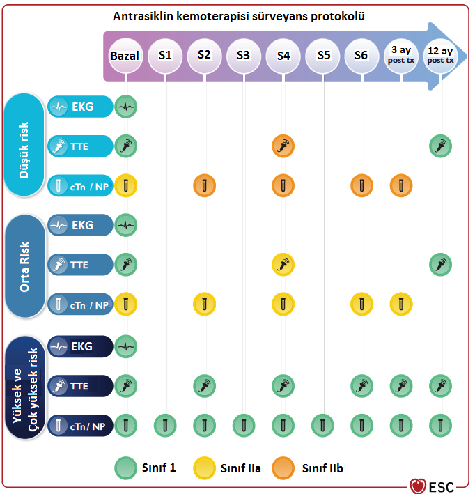 Şekil-1. Antrasiklin kemoterapisi alan hastalarda kardiyotoksisite takip şeması Kısaltmalar: S1: Birinci siklus, Post tx: Tedavi sonrası, EKG: Elektrokardiyografi, TTE: Transtorasik ekokardiyografi, cTn: Kardiyak troponin, NP: Natriüretikpeptit