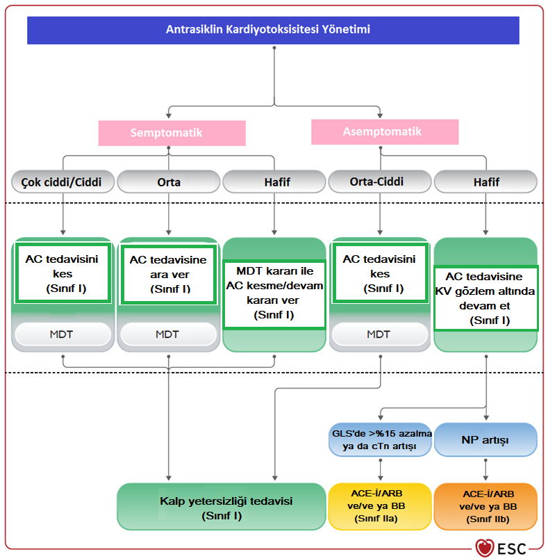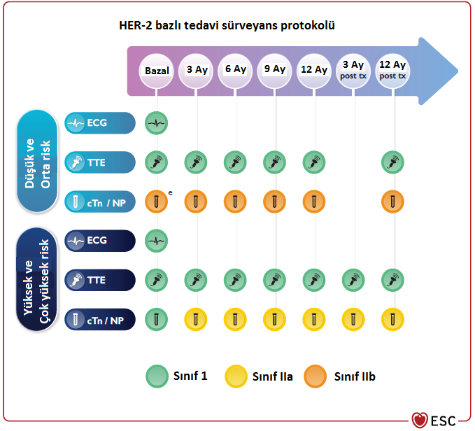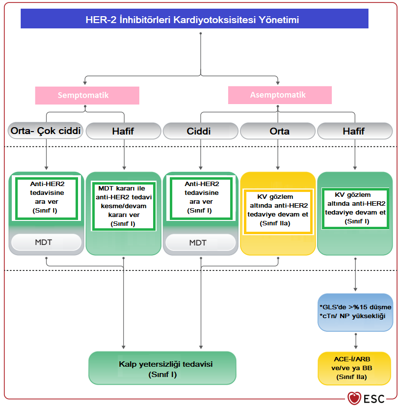 Şekil-2. Antrasiklin kardiyotoksisitesi yönetimi Kısaltmalar: AC: Antrasiklin, KV: Kardiyovasküler, MDT: Multidisipliner takım, GLS: Global longitudinalstrain, cTn: Kardiyak troponin, NP: Natriüretik peptit, ACE-İ: ACE inhibitörü, ARB: Anjiyotensin reseptör blokörü, BB: Beta blokör HER 2 Bazlı Tedavi Kardiyotoksisitesi HER-2 inhibitörleri (Trastuzumab, lapatinib, TDM-1 vb.), meme kanseri ve mide kanseri tedavisinde kullanılan ajanlardır. HER-2 inhibitörleri kalp yetersizliğine neden olabilirler ve antrasiklin ilişkili toksisiteden farklı olarak HER-2 inhibitörü toksisitesi dozdan bağımsızdır ve ilaç kesildikten sonra genellikle geri dönüşümlüdür. HER-2 inhibitörü kullanan hastalarda kardiyotoksisite sürveyansı Şekil-3’te özetlenmiştir.