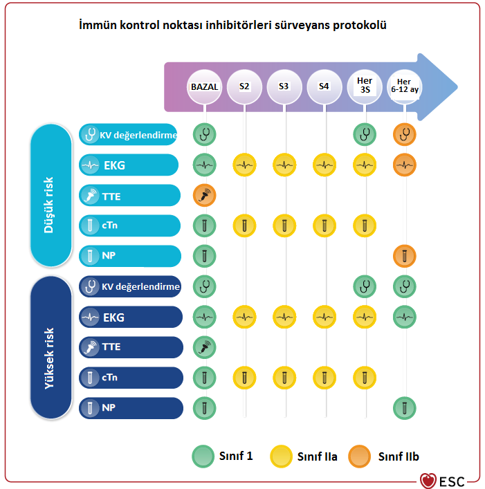 Şekil-4. HER2 inhibitörü kardiyotoksisitesi yönetimi Kısaltmalar: KV: Kardiyovasküler, MDT: Multidisipliner takım, GLS: Global longitudinalstrain, cTn: Kardiyak troponin, NP: Natriüretik peptit, ACE-İ: ACE inhibitörü, ARB: Anjiyotensin reseptör blokörü, BB: Beta blokör İmmün Kontrol Noktası İnhibitörleri İlişkili Kardiyotoksisite İmmün kontrol noktası inhibitörleri (Pembrolizumab, nivolumab vb.), immün sistemi aktive ederek kanser hücrelerine karşı olan immün yanıtta artışa neden olurlar. Hematolojik maligniteler, melanom, akciğer kanseri ve ürolojik kanserler başta olmak üzere pek çok kanser tedavisinde kullanılmaktadırlar. İmmün kontrol noktası inhibitörleri otoimmün yan etkilere neden olabilirler. Kardiyak toksisite; miyokardit, perikardit, ileti bozuklukları, aritmiler ve dislipidemi olarak prezente olabilmektedir. Miyokardit, kalp yetersizliğine progrese olabilir ve genellikle tedavinin ilk 12 haftasında ortaya çıkmakla birlikte 20. haftaya kadar miyokardit gelişen vakalar bildirilmiştir. Miyokardit tanısından genellikle izlemde gelişen EKG değişikliği ya da kardiyak enzim yüksekliği ile şüphe edilir. Miyokardit düşünülen hastalara ekokardiyografi ve kardiyak MRG yapılmalıdır. MRG’de immün kontrol noktası inhibitörleri ilişkili miyokardit için spesifik bulgu olmamaklar birlikte tanıda rutin miyokardit tanısında kullanılan Lake Louise kriterleri kullanılmaktadır. PET ve endomiyokardiyal biyopsi de tanı koyma aşamasında başvurulabilecek diğer yöntemlerdir. İmmün kontrol noktası inhibitörleri ilişkili kardiyotoksisite sürveyansı Şekil-5’te özetlenmiştir.