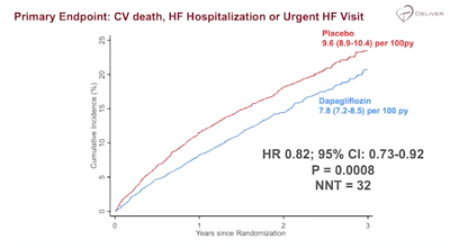 Dapagliflozin in Heart Failure with Mildly Reduced or Preserved Ejection Fraction (DELIVER Trial) (Dr. Gizem Çabuk)Dapagliflozin in Heart Failure with Mildly Reduced or Preserved Ejection Fraction (DELIVER Trial) Dr. Gizem Çabuk Dr. Gizem Çabuk İzmir Tepecik Eğitim ve Araştırma Hastanesi Kardiyoloji Kliniği Sodyum-glukoz ko-transporter 2 (SGLT2) inhibitörleri ejeksiyon fraksiyonu (EF) ?%40 olan hastalarda kalp yetersizliği nedeni ile hastaneye yatış ve kardiyovasküler ölüm riskini azaltmaktadır. Ejeksiyon fraksiyonu daha yüksek olan hastalarda SGLT2 inhbitörlerinin etkisi daha belirsizdir. DELIVER çalışması, tedavi seçeneklerinin kısıtlı olduğu bir hasta grubu olan hafif azalmış ve korunmuş EF’li hastalarda dapagliflozinin kardiyovasküler mortalite ve morbidite üzerine etkisini araştırmaktadır. DELIVER 20 ülkeden 353 merkezin katıldığı randomize, çift-kör, plasebo kontrollü bir çalışmadır. Çalışmaya 40 yaş ve üzeri, EF > %40 (daha önceden EF ? %40 olan- improved EF’li- hastalar dahil) ve semptomatik kalp yetersizliği (NYHA FK II-IV) olan 6263 hasta alınmış ve dapagliflozin (10 mg 1x1) ve plasebo kollarına randomize edilmiştir. Primer sonlanım, birleşik olarak kalp yetersizliğinin kötüleşmesi (kalp yetersizliği nedeni ile plansız yatış ve acil başvuru) ve kardiyovasküler ölümdür. Hastaların ortalama yaşı 72 ve %44’ü kadın cinsiyette ve ortalama EF %54, %18 hastanın daha önceden EF ‘si ≤ %40’dı. Yüzde 45 hastada tip-2 DM mevcuttu. Randomizasyon sırasında %77 hasta ACE inhibitörü/ARB ya da ARNI , %83’ü beta-bloker, %43 ü MRA kullanmaktaydı. Median 2.3 yıl içinde primer sonlanım dapagliflozin grubunda 3131 hastanın 512’sinde (%16.4) , plasebo kolunda ise 3132 hastanın 610’unda (% 19.5) gerçekleşti (HR, 0.82; %95 CI, 0.73-0.92; P<0.001) (Şekil 1). Kalp yetersizliğinde kötüleşme dapagliflozin grubunda 368 hastada (%11.8), plasebo grubunda 455 hastada (%14.5) (HR, 0.79; %95 CI 0.69-0.91); kardiyovasküler nedenli ölüm sırası ile 231 (%7.4) ve 261 (%8.3) hastada ( HR, 0.88;%95 CI,0.74-1.05) gerçekleşti. İkincil sonlanımlardan kalp yetersizliği nedeni ile toplam hastaneye yatış ve kardiyovasküler ölüm, dapagliflozin grubunda plaseboya oranla daha az olarak gözlendi (rate ratio 0.77; 95% CI 0.67–0.89). Kansas City Kardiyomiyopati Anketi ile değerlendirilen toplam semptom yükü de yine dapagliflozin kolunda daha azdı (semptom skorunda ortalama fark 2.4; 95% CI 1.6–3.2). Sonuçlar EF ? %60 ve < %60 olan hastalarda ve de önceden belirlenmiş alt gruplarda (diyabeti olan ve olmayan) da benzerdi. İlaca bağlı yan etki insidansı iki grupta benzerdi. Sonuç olarak şu ana kadar yapılan en geniş çalışma olan DELIVER çalışmasında dapagliflozin hafif azalmış ve korunmuş ejeksiyon fraksiyonlu kalp yetersizliği olan hastalarda, kalp yetersizliğinde kötüleşme ve kardiyovasküler ölümden oluşan birleşik riski %18 azalttı. Bu veriler dapagliflozinin düşük EF’li kalp yetersizliği hastalarında olduğu gibi, tüm kalp yetersizliği hastalarında EF ‘den bağımsız olarak temel tedavi olarak kullanılmasını desteklemektedir.
