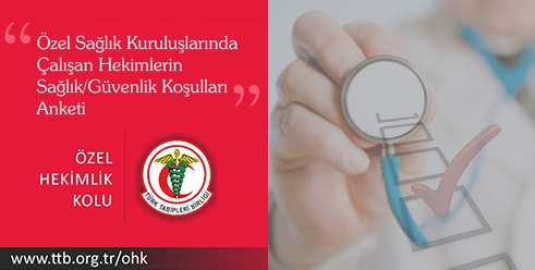 TTB Özel Hekimlik Kolu tarafından Özel Sağlık Kuruluşlarında Çalışan Hekimlerin Sağlık / Güvenlik Koşulları konulu bir anket hazırlanmıştır.