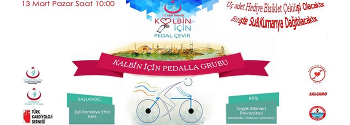 Bu yıl Tıp Haftası çerçevesinde, Kalbin İçin Pedalla Grubumuz İstanbul’da, 13 Mart Pazar günü Sağlıklı Bir Yaşama Kalbin İçin Pedalla adlı kıtalararası bir etkinlik düzenleyecektir. Saat 09.30’da Şişli Etfal Hastanesi önünde toplanılarak 10.00’da pedal çevirilecek ve etkinlik Sağlık Bilimleri Üniversitesi Haydarpaşa Kampüsü önünde sona erecektir.
