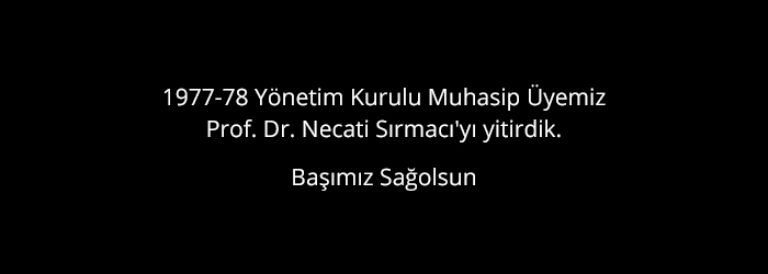 1977-78 Yönetim Kurulu Muhasip Üyemiz Prof. Dr. Necati Sırmacı'yı yakalandığı amansız hastalık nedeniyle yitirdik. Cenazesi 6 Ocak Çarşamba 10.00'da, Cerrahpaşa Tıp Fakültesi'ndeki tören ardından öğleyin Fatih Camii'nden kaldırılacak ve Topkapı Çamlık-4 Aile Mezarlığına defnedilecek.