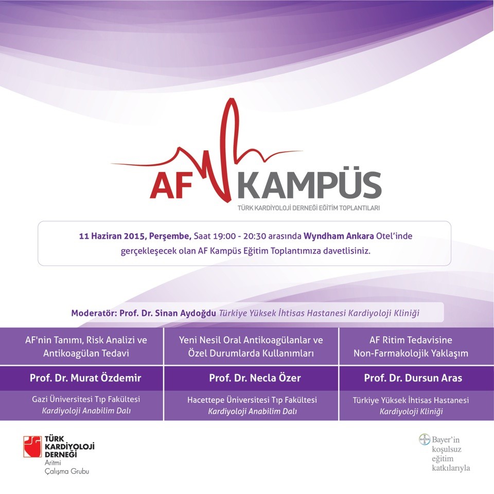 Aritmi Çalışma Grubumuzun hazırladığı Atriyal Fibrilasyon lokal toplantılarının üçüncüsü AF Kampüs 11 Haziran'da Ankara'da olacak. Wyndham Ankara Otel'de, 11 Haziran 2015 saat 19.00-20.30 arasında gerçekleştirilecektir.