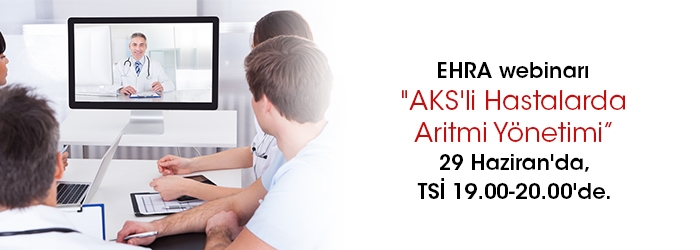 EHRA webinarı "AKS'li Hastalarda Aritmi Yönetimi" 29 Haziran'da, TSİ 19.00-20.00'de. EHRA üyelerine bedelsiz.