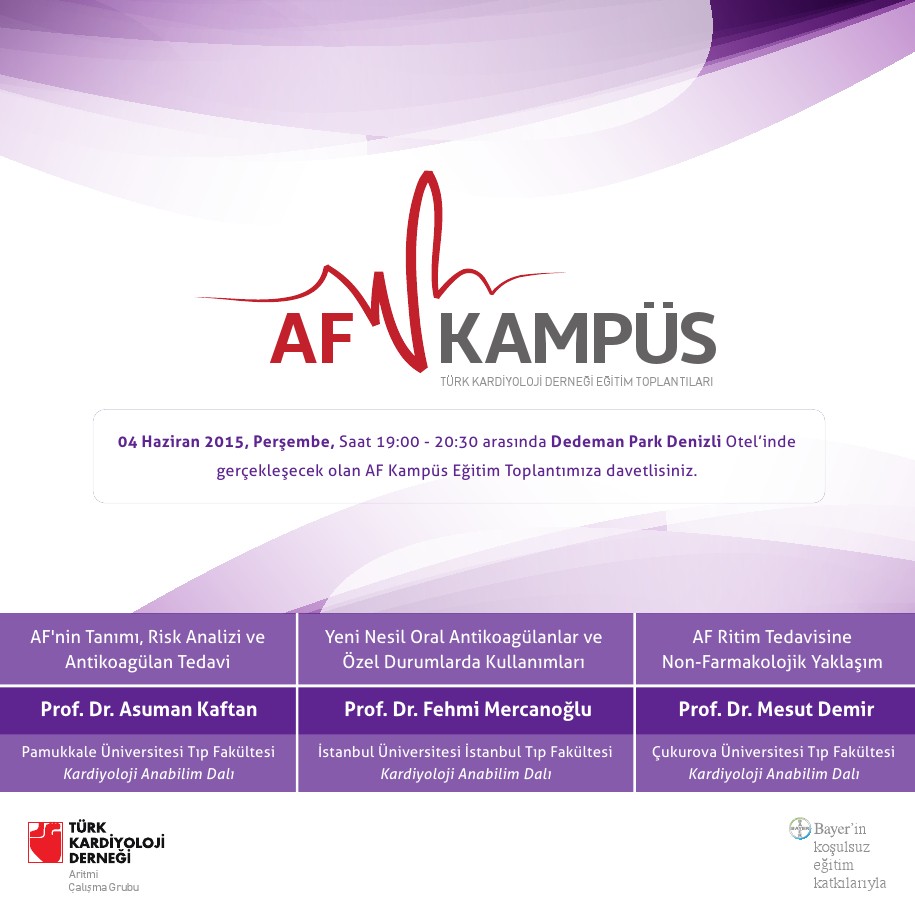 Aritmi Çalışma Grubumuzun hazırladığı Atriyal Fibrilasyon lokal toplantıları AF Kampüs 4 Haziran'da Denizli'den başlıyor. İlk toplantımız Dedeman Park Denizli Hotel'de, 4 Haziran 2015 saat 19.00-20.30 arasında gerçekleştirilecektir.