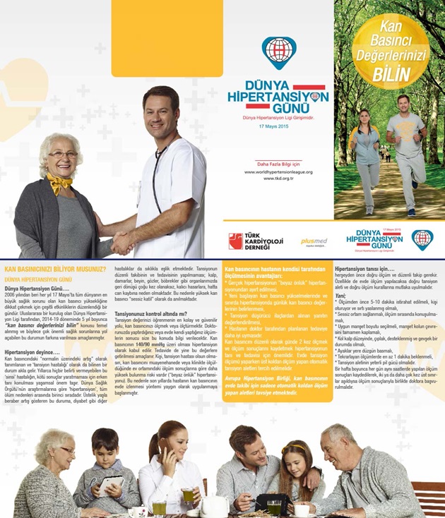 Dünya Hipertansiyon Günü çerçevesinde 12 Mayıs Salı günü saat 14.00-16.00'da Levent Kültür Merkezi'nde ve 18 Mayıs günü saat 14.00-16.00’da Çankaya Belediyesi Halk Sağlığı Salonu’nda toplum bilgilendirme konuşmaları ve kan basıncı ölçüm çalışmaları yapılacaktır.