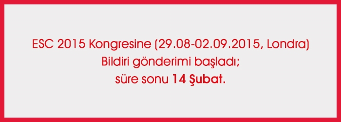 Avrupa Kardiyoloji Derneği (ESC) tarafından 29.08-02.09.2015, Londra, Birleşik Krallık’ta yapılacak Avrupa Kardiyoloji Kongresi’ne bildiri özeti gönderimi başladı. Bildiri gönderme süresi 14 Şubat 2015’te bitiyor.