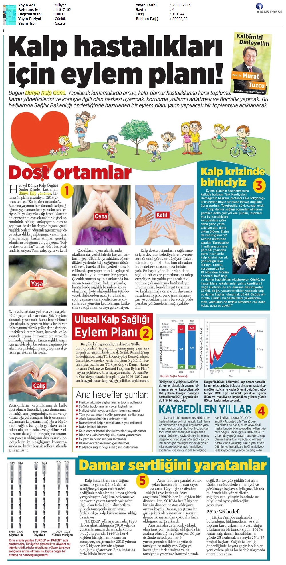 Milliyet Gazetesi 29 Eylül günü sağlık sayfalarını Prof. Dr. Murat Tuzcu ve Prof. Dr. Lale Tokgözoğlu’nun uyarıcı ve kapsamlı yazılarına ayırdı.