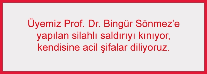 Üyemiz Prof. Dr. Bingür Sönmez'e yapılan silahlı saldırıyı kınıyor, kendisine acil şifalar diliyoruz.
