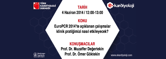 Türkiye'nin TTB-STE kredili ilk online Sanal Kongresi E-Kardiyoloji'de 4 Haziran canlı yayınında Prof. Dr. M. Değertekin ve Prof. Ö. Göktekin "EuroPCR 2014'te açılanan çalışmaların klinik pratiğimizi nasıl etkileyeceği"ni anlatacaklar.