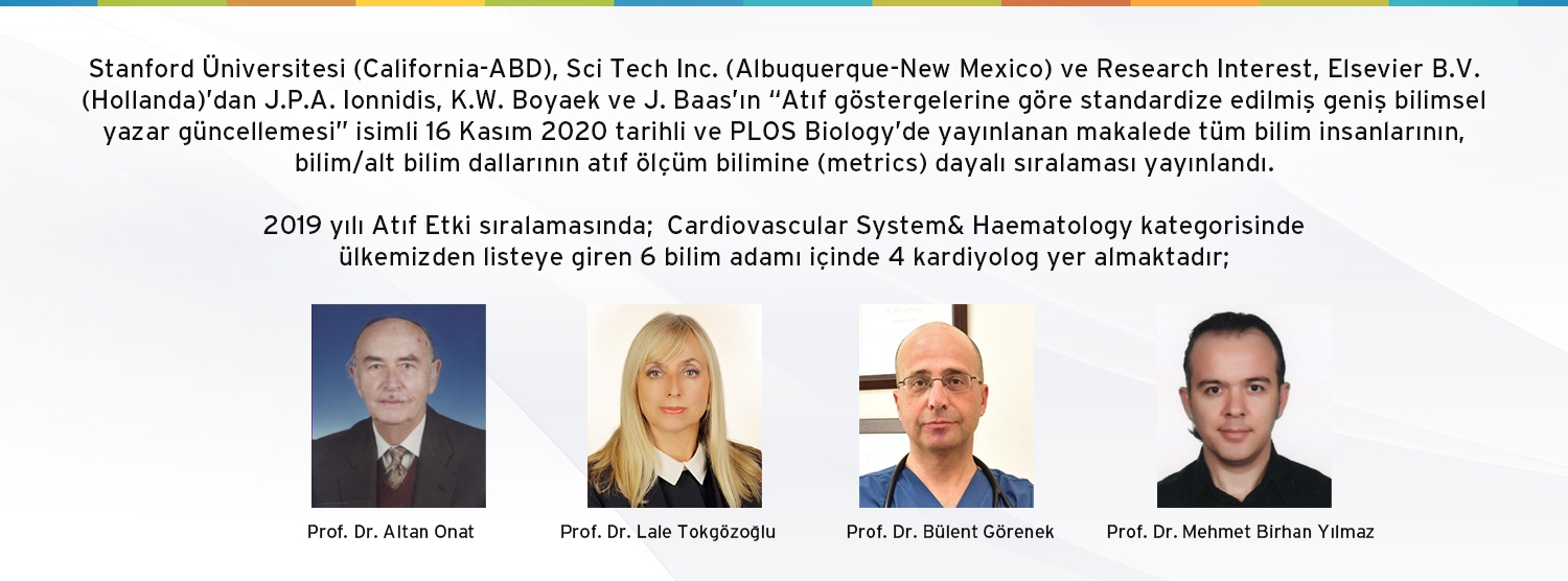 Stanford Üniversitesi (California-ABD), Sci Tech Inc. (Albuquerque-New Mexico) ve Research Interest, Elsevier B.V. (Hollanda)’dan J.P.A. Ionnidis, K.W. Boyaek ve J. Baas’ın “Atıf göstergelerine göre standardize edilmiş geniş bilimsel yazar güncellemesi” isimli 16 Kasım 2020 tarihli ve PLOS Biology’de (https://data.mendeley.com/datasets/btchxktzyw/2) yayınlanan makalede tüm bilim insanlarının, bilim/alt bilim dallarının atıf ölçüm bilimine (metrics) dayalı sıralaması yayınlandı. 2019 yılı Atıf Etki sıralamasında (https://data.mendeley.com/datasets/ btchxktzyw/2; Tablo S7-singleyr-2019) ; Cardiovascular System& Haematology kategorisinde ülkemizden listeye giren 6 bilim adamı içinde 4 kardiyolog yer almaktadır;