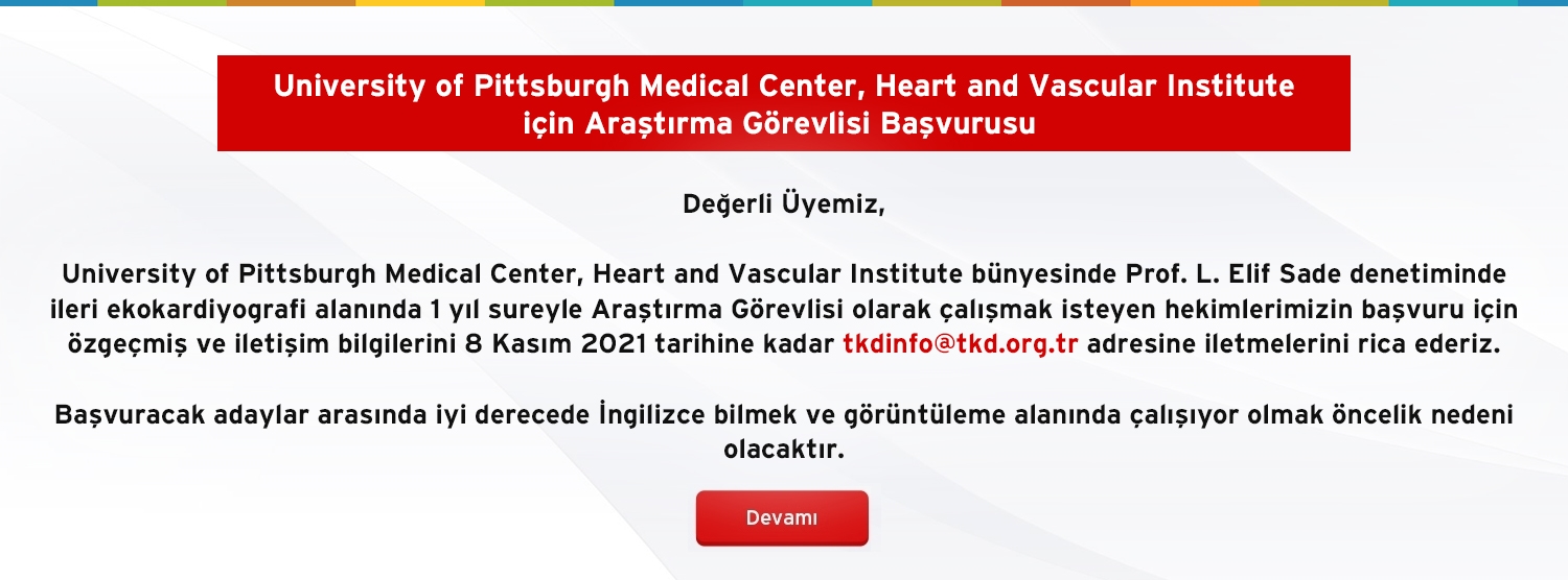 University of Pittsburgh Medical Center, Heart and Vascular Institute bünyesinde Prof. L. Elif Sade denetiminde ileri ekokardiyografi alanında 1 yıl sureyle Araştırma Görevlisi olarak çalışmak isteyen hekimlerimizin başvuru için özgeçmiş ve iletişim bilgilerini 8 Kasım 2021 tarihine kadar tkdinfo@tkd.org.tr adresine iletmelerini rica ederiz.
