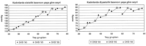 Sistolik basınç: 930 kadında sistolik kan basıncının yaş gruplarına göre ortalama değerleri Şekil-3’de sunulmaktadır. 1990 yılında ortalama 125 mmHg olan sistolik basınç, 5 yıl sonra 5 mmHg artmış, 1998’de toplam 8.2 mmHg artışla 133.2 mmHg’ya yükselmiştir. Kadınların 8 yıl yaşlanmasının 7.2 mmHg artışa yol açacağı öngörüldüğüne göre, yaşlanmadan arındırılan ortalama sistolik basınç kadınlarımızda 8 yılda sadece 1 mmHg yükselmiştir.