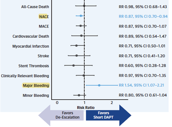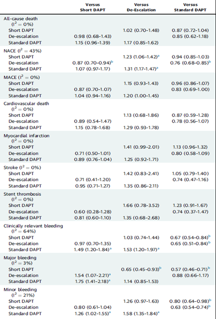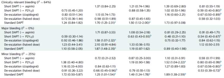 “DE-ESKALASYON” (Dr. Ersin Çağrı Şimşek) Yorumlayan: Dr. Ersin Çağrı Şimşek Makale: Short Duration of DAPT Versus De-Escalation After Percutaneous Coronary Intervention for Acute Coronary Syndromes Link: Laudani C, Greco A, Occhipinti G, Ingala S, Calderone D, Scalia L, Agnello F, Legnazzi M, Mauro MS, Rochira C, Buccheri S, Mehran R, James S, Angiolillo DJ, Capodanno D. Short Duration of DAPT Versus De-Escalation After Percutaneous Coronary Intervention for Acute Coronary Syndromes. JACC Cardiovasc Interv. 2022 Feb 14;15(3):268-277. doi: 10.1016/j.jcin.2021.11.028. PMID: 35144783. AKUT KORONER SENDROMLARDA PERKÜTAN KORONER GİRİŞİM SONRASI KISA SÜRELİ DAPT’A KARŞI YOĞUNLUK AZALTICI TEDAVİ “DE-ESKALASYON” GİRİŞ Akut koroner sendrom sonrası (AKS) perkütan koroner girişim (PKG) ile tedavi edilen hastalarda, trombüs riskini azaltmak için aspirin ve bir P2Y12 inhibitörü ile ikili anti-trombosit tedavi (DAPT) tipik olarak 12 ay boyunca önerilir. DAPT, artmış mortalite ile ilişkili majör kanama riskini artırdığından, DAPT süresinin kısaltılması (yani, aspirin veya P2Y12 inhibitörünü keserek) ve prasugrel/tikagrelor’un klopidogrele veya daha düşük bir doza düşürülmesi (de-eskalasyon) gibi stratejiler öne sürülmüştür. Bununla birlikte en son Avrupa kılavuzlarında AKS’de kısa DAPT ve de-eskalasyon için tavsiye sınıfları, sırasıyla Sınıf 2a ve 2b idi. Ağ meta analizi (Network meta-analysis), bir çalışma ağı içinde birden fazla stratejinin eşzamanlı karşılaştırmasını sağlar. Bir Bayes çerçevesi içinde (Bayesian framework), her tedavi için en iyi olma olasılığı veya daha genel olarak, belirli bir sıraya sahip olma olasılığı değerlendirilebilir. Bu çalışmada, PKG uygulanan AKS'li hastalar için kısa DAPT'ın ve deeskalasyonun nispi yararlarını “multiple-treatment network frequentist and Bayesian frameworks” aracılığıyla değerlendirilmiştir. METOD Kısa DAPT (yani, 1-6 ayda P2Y12 inhibitörü veya aspirinin kesilmesi) veya de-eskalasyon (klopidogrel veya azaltılmış dozda prasugrel veya tikagrelor) ile standart DAPT’ın (çalışma kolunda 12 ay veya daha uzun süre) karşılaştırıldığı aşağıdaki kriterleri karşılayan çalışmalar taranmış: 1) Hastaların %75 inden fazlasının AKS olduğu veya AKS subgrup analizi olan randomize kontrollü çalışma; 2) Hastaların %75'inden fazlasında ilaç kaplı stent implantasyonu ile yapılmış PKG; 3) 6 aydan daha uzun klinik sonuçları raporlanması. Dışlama kriterleri ise hastaların %75'inden fazlasının oral antikoagülasyon alması veya DAPT tedavisinde oral P2Y12 inhibitörlerinden farklı ilaçların kullanılmasıdır. Bilgi kaynakları, 1 Ocak 2009-30 Ekim 2021 tarihleri arasında MEDLINE, Cochrane ve Web of Science veritabanlarını içermektedir. Birincil ve ikincil sonlanım noktaları, mevcut en uzun takip süresinde: 1- Tüm nedenlere bağlı ölüm (birincil sonlanım) ve çalışmaya tanımlı net olumsuz kardiyovasküler olaylar (NACE); dahil olmak üzere net fayda ölçümleri 2- çalışma tanımlı majör advers kardiyovasküler olaylar (MACE), kardiyovasküler ölüm, miyokard enfarktüsü, felç ve stent trombozu dahil olmak üzere trombotik sonlanım noktaları; 3- klinik olarak anlamlı kanama, majör kanama ve minör kanama dahil olmak üzere kanama son noktaları. SONUÇLAR Toplam 50.602 hastayı kapsayan 29 çalışma seçilerek meta-analize dahil edilmiş. Şekil 1, üç ve beş düğümlü tedavi ağlardaki çalışmaların geometrisini göstermektedir. 3 düğümlü analizde, 19 kısa DAPT çalışması ve 10 de-eskalasyon çalışması vardır. 5 düğümlü analizde ağ, P2Y12 inhibitörünün kesilmesiyle birlikte 13 kısa DAPT çalışması, aspirinin kesilmesiyle birlikte 5 kısa DAPT çalışması, klopidogrel'e de-eskalasyon yapılan 6 çalışma ve azaltılmış bir prasugrel veya tikagrelor dozuna de-eskalasyon yapılan 4 çalışmadan oluşturulmuştur. Her iki ağda da, kısa DAPT ve de-eskalasyonu doğrudan karşılaştırmalarının olmaması nedeniyle kapalı döngüler yoktur. Tamamen AKS kohortlarında gerçekleştirilen 15 çalışma ve tüm PKG kohortlarında gerçekleştirilen çalışmalardan elde edilen 14 AKS alt grup analizleri vardır. Vakaların çoğunda PKG ile 12 ay arasında takiplere ulaşılabilmiştir. 3 düğümlü analizi; Tablo 1’de, 3 düğümlü Frequentist Network Meta-analizinin sonuçlarını görülmektedir.
