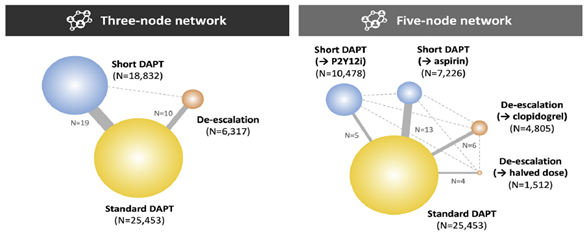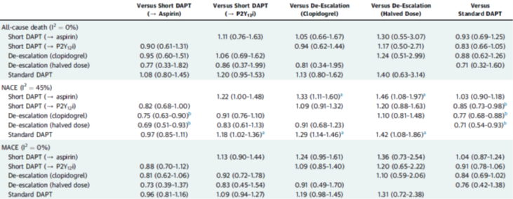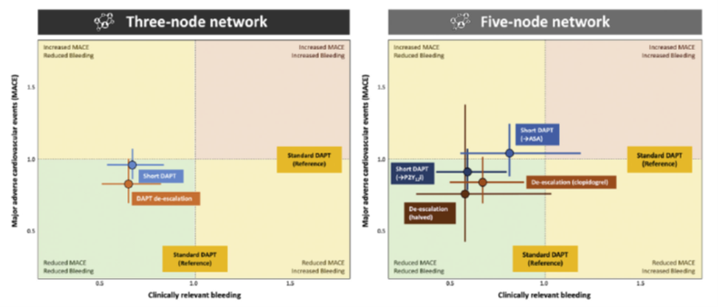 TARTIŞMA Standart DAPT referans olarak kullanıldığında kısa DAPT ve de-eskalasyonun dolaylı karşılaştırmasının sonuçları aşağıdaki gibi özetlenebilir: 1- kısa DAPT ve de-eskalasyon, ölüm ve kardiyovasküler ölüm için benzer bir risk taşıyordu; 2- kısa DAPT, majör kanama riskini önemli ölçüde azalttı, bu son noktaya göre Bayes tedavi stratejileri sıralamasında ilk sırada yer aldı ve NACE riskini artırdı. 3- de-eskalasyon, NACE riskini önemli ölçüde azalttı, majör kanama riskini artırdı ve MACE, miyokard enfarktüsü, felç ve stent trombozu açısından Bayes tedavi stratejileri sıralamasında ilk sırada yer aldı. Kısa DAPT ve de-eskalasyonu AKS'li hastalarda karşılaştıran Kuno ve ark. ve Shoji ve arkadaşları tarafından yapılan 2 farklı ağ meta-analizinde; kısa DAPT ve de-eskalasyon standart DAPT’a göre trombotik olaylarda anlamlı bir fark olmaksızın kanamayı azalttığı gösterilmiştir. De-eskalasyon ile kastedilen, AKS'den sonraki ilk dönemde prasugrel veya tikagrelor kullanarak daha yüksek trombotik koruma elde etmek ve ardından daha düşük etkinlikte bir antitrombosit stratejisine geçerek kanamayı azaltmaktır. Kısa DAPT ile karşılaştırıldığında, de-eskalasyon ile majör kanama riski daha yüksekti. Bu nedenle kısa DAPT, yüksek PRECISE-DAPT skoruna sahip kanama riski yüksek hastalarda daha iyi bir yaklaşımı temsil edebilir. Bununla birlikte, de-eskalasyon, tek antitrombosit tedavi ile karşılaştırıldığında daha büyük net fayda ile sonuçlanmıştır. Daha yüksek kanama riski bağlamında bu tür bir fayda, iskemik olaylarda olası bir azalma anlamına gelir. Bu çalışmanın birincil analizi, muhtemelen kalıntı tip II hatanın (yani düşük güç) bir sonucu olarak iskemik uç noktalarda istatistiksel olarak anlamlı farklılıkları ortaya çıkarmada başarısız olmuş. AKS'li hastaların mevcut AKS kılavuzlarına göre 12 aylık DAPT almaları önerilir, ancak DAPT süresinin trombotik ve kanama komplikasyonları için bireysel risklere göre uyarlanması da bir seçenektir. Güncel kılavuzlarda DAPT ve de-eskalasyon için tavsiye sınıfları, sırasıyla Sınıf 2a ve 2b dir. Bu çalışmanın sonuçları kısa DAPT ile karşılaştırıldığında, DAPT'ın de-eskalasyonu, ölüm için benzer bir risk ve NACE için daha düşük bir risk (toplam net faydanın 2 ölçütü) gösterdiğinden, bu öneri sıralamasına meydan okumaktadır. Çalışmanın yazarları bu 2 tedavi seçeneği için öneri sınıfının en azından aynı olması gerektiğini ileri sürmektedirler. SONUÇLAR PKG uygulanan AKS'li hastalar için DAPT modülasyonu stratejileri arasında, kısa DAPT ve deeskalasyon arasında ölüm riskinde hiçbir fark bulunamamış. De-eskalasyon, NACE riskinin azalmasıyla, kısa DAPT ise majör kanama riskinin azalmasıyla ilişkilidir. Bu iki DAPT stratejisini doğrudan karşılaştıran randomize çalışmalar yoktur. Bu çalışmanın verileri klinisyenleri 2 çağdaş DAPT stratejisinin göreceli sonuçları hakkında bilgilendiricidir. Tromboz ve kanama riskleri arasındaki denge temelinde kişiselleştirilmiş tedavi kararlarını desteklemektedir. Tablo 1. Frequentist Network Meta-analizinin Sonuçları (3 Düğüm) Şekil-1. 3 Düğümlü ve 5 Düğümlü Ağlar Şekil 2. De-eskalasyon ve Kısa İkili Antiplatelet Tedavisinin 3-Düğümlü Frequentist indirekt karşılaştırılması Şekil 3. Majör Advers Kardiyovasküler Olaylar (MACE) ve Klinik Olarak Anlamlı Kanama Açısından Farklı Stratejilerin Tedavi Etkilerinin İki Değişkenli Analizleri Tablo 2. . Frequentist Network Meta-analizinin Sonuçları ( 5 Düğüm)